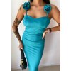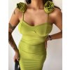 Midi priliehavé šaty na ramienka z ľahkého materiálu. 2 ozdobné kvety na ramienkach. Chrbát s gumičkou.